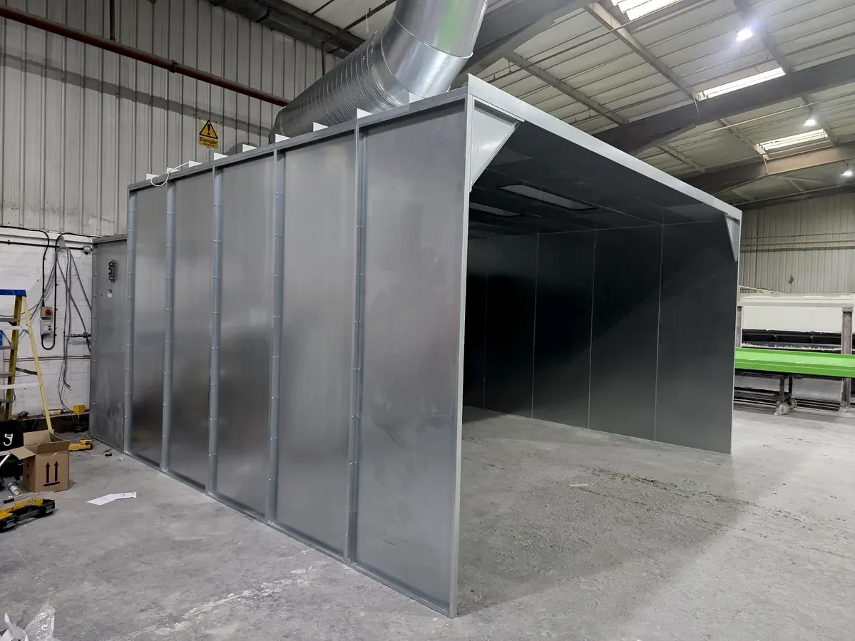 Unitech Machinery was commissioned by Stormking to design and fabricate a new single skin open booth, integrating with their existing rear extraction plenum, frame, and fan. By engineering the new enclosure to mate directly with the client’s existing infrastructure, Unitech delivered a cost-effective solution that avoided unnecessary capital expenditure on new extraction equipment.