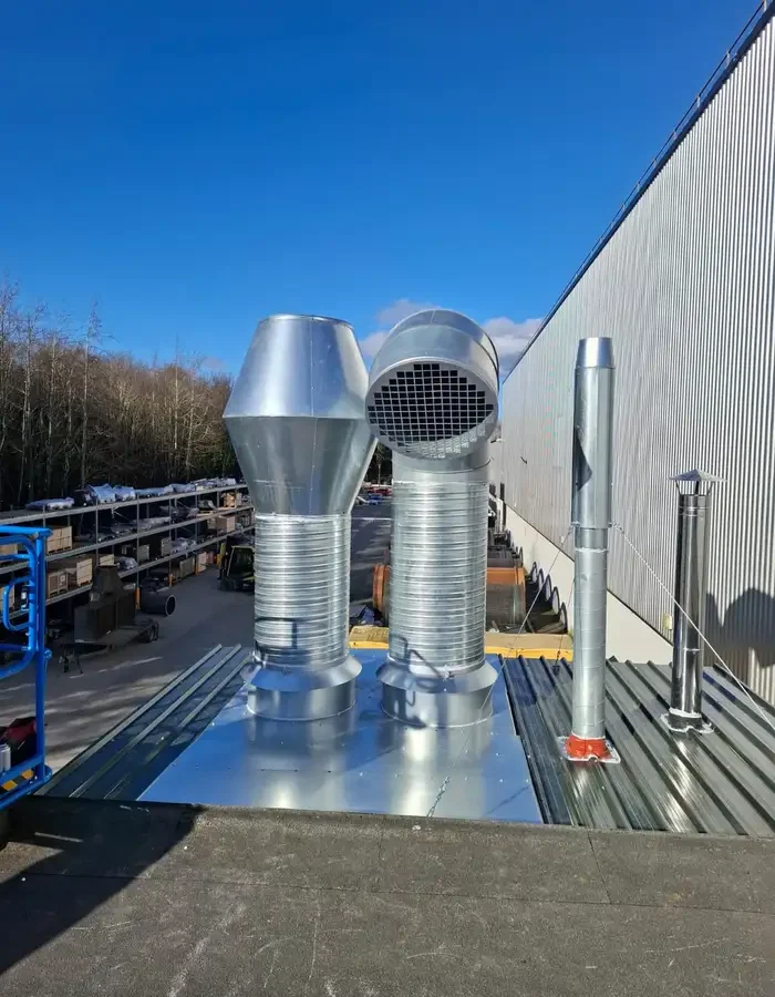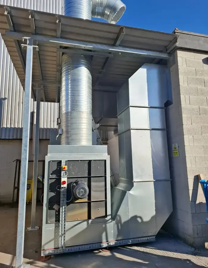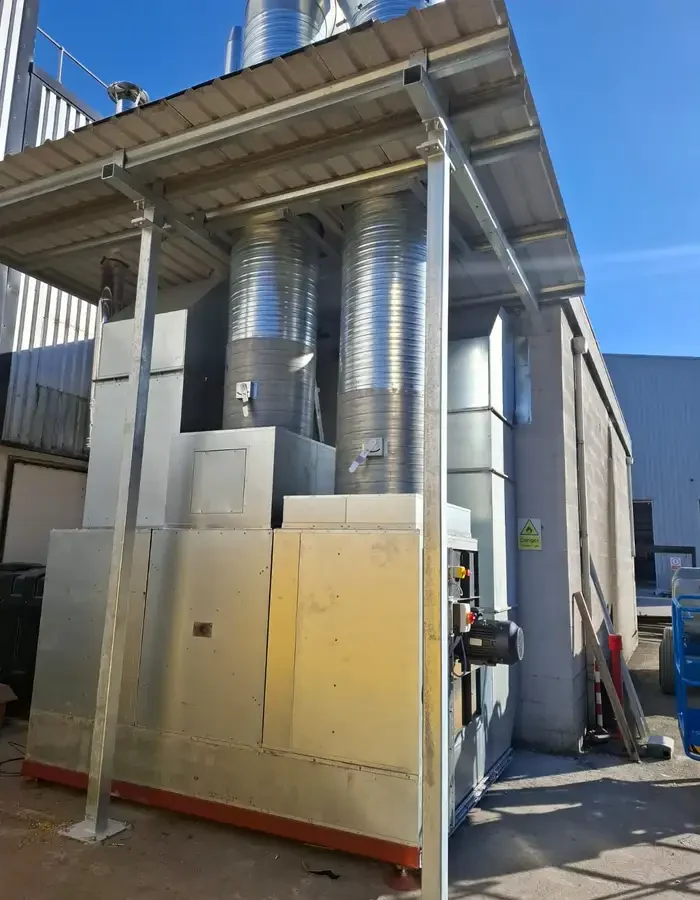 Synthetic filter panels are housed within a rear wall frame system, capturing overspray before air is passed through to the external plant. Twin plant units are installed at ground level under a purpose-built weather shelter, with extraction discharged to atmosphere via twin conical stacks mounted on the roof.